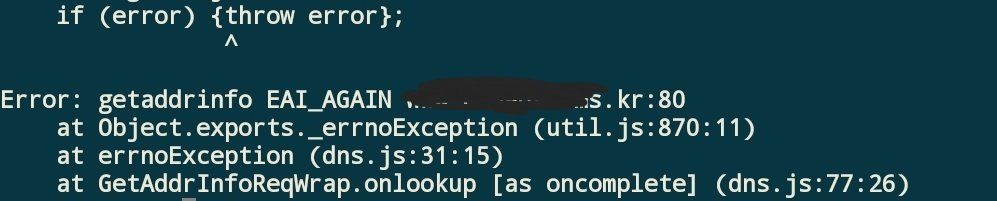 Nodejs 에서 EAI_AGAIN 에러는 DNS lookup 에러입니다.