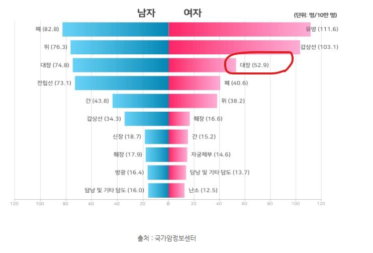 여성에서 대장암의 발생률은 높은 편입니다. 특이 유방암 갑상선암이 여성에서 특별하게 많이 발생한다는 것을