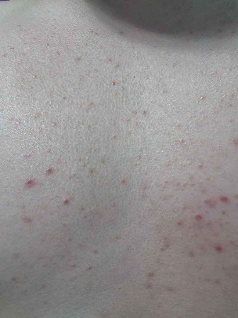 8월부터 가슴팍에 모낭염이 났습니다 그때는 습진과 같이나서 습진을 먼저 치료하고 이후 모낭염을 치료 하고 있습니다 근데 그후 아무리 병원을 가고 약을 먹고 연고를 발랐지만 조금은 나아져도 사진의 상태 이후로는 전혀 나아지지 않고 있습니다