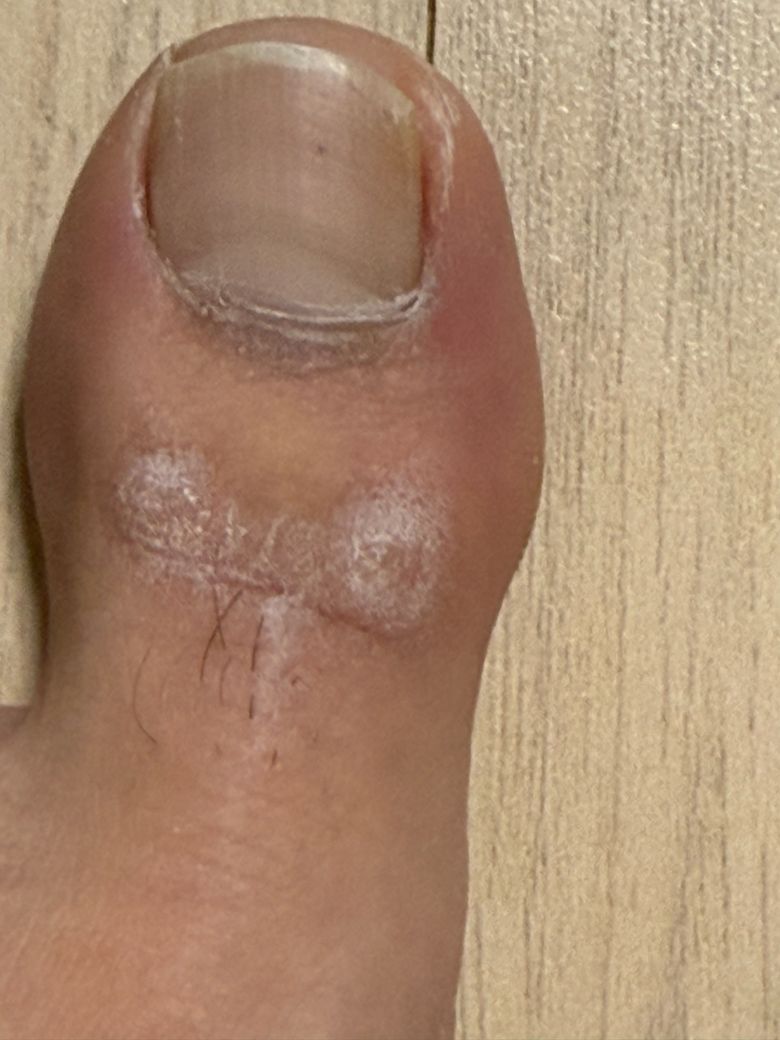 사진 소견을 종합하면 단순한 건조성 각질보다는 마찰로 생긴 연성 티눈(soft corn) 또는 압박성 굳은살 가능성이 더 높아 보입니다. 위치가 엄지발가락 중간 측면이고, 하얗게 불어 보이며 경계가 비교적 분명한 점이 특징적입니다. 특히 신발 안에서 반복적으로 눌리거나 쓸리는 부위에서 이런 형태가 잘 생깁니다.