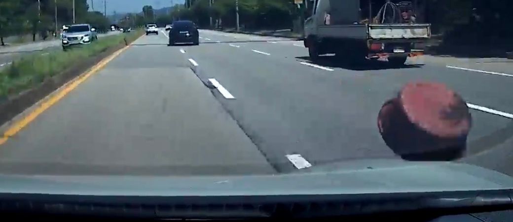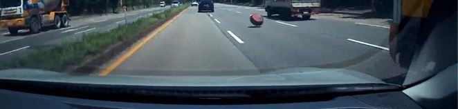 1차로 주행 중 3차선이 있던 트럭에서 고무 대야? 같은게 떨어져서 날아와서 2차선이 있던 덤프와 제 사이를 지나가서 제 차 뒤쪽으로 떨어졌습니다