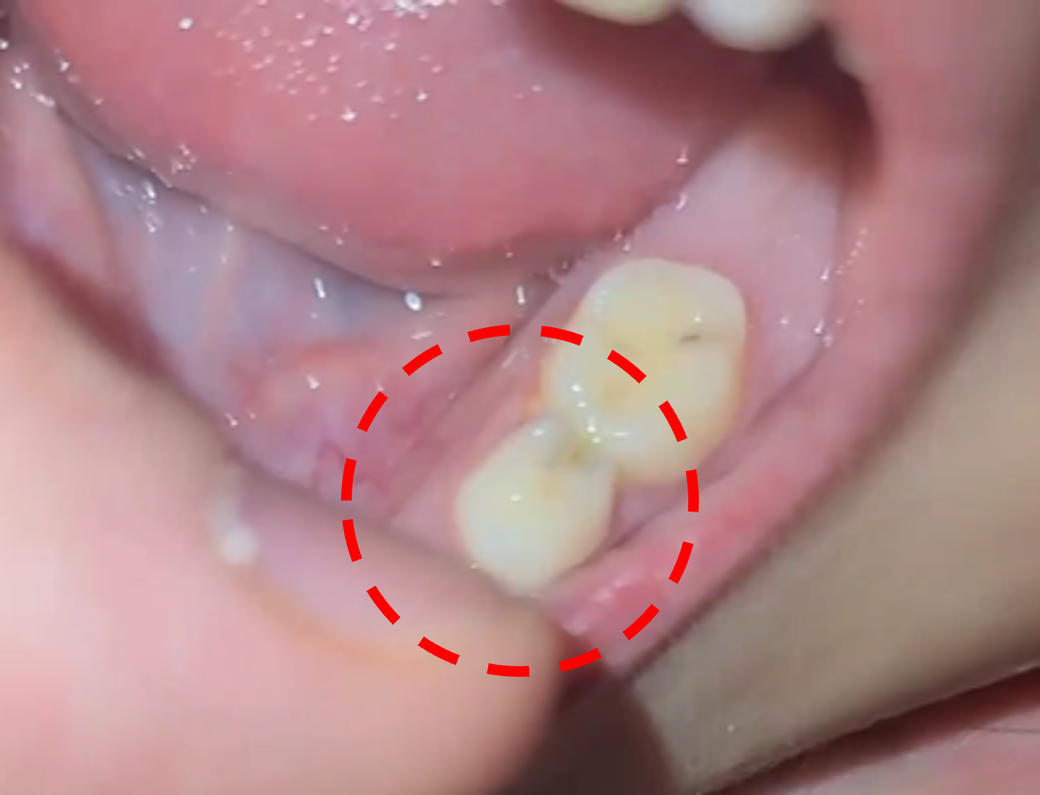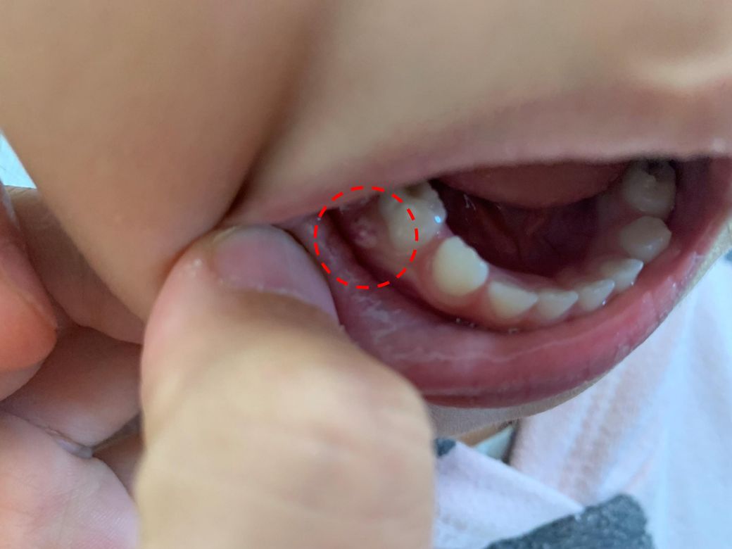 사진으로만 봤을경우에는 유치 후방에 충치로 인해서 내부 신경에 감염이 되었을 가능성이 있습니다.