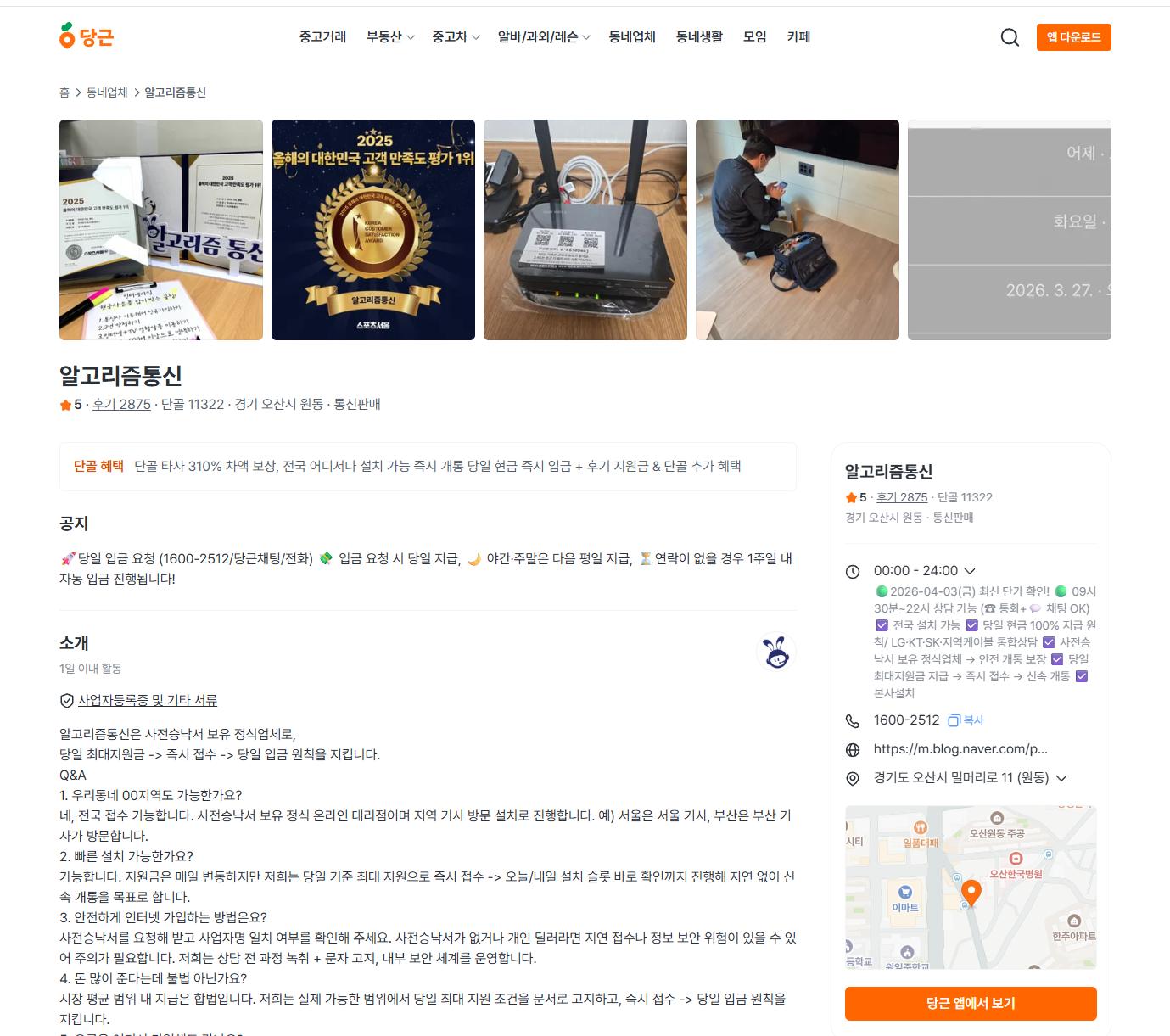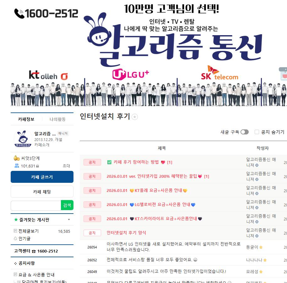 근 단골 1만명 이상 네이버 카페 10만 이상 운영하는 인터넷설치 후기,우리동네 인터넷 가입 센터(SK,LG,KT) 당일지급. 알고리즘통신 : 네이버 카페 정상업체네요 . 인터넷 가입할때는 사전승낙서라는 자격증이 있고 없고가 중요한데 . 사전승낙서 있는 정상업체로나옵니다. 진행하셔도괜찮을거 같습니다