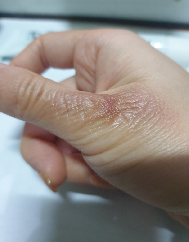 1도 화상에 부분 2도화상 입은것으로 파악됩니다.( 2도부분 얇게 물집이있었던 듯합니다.문지르면 겉피부가 밀리는정도?안에 물은 없었어요)