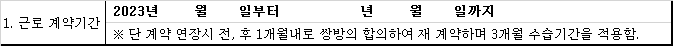 "단 계약 연장시 전, 후 1개월내로 쌍방의 합의하여 재 계약하며 3개월 수습기간을 적용함" 이라고 기재되어있습니다.