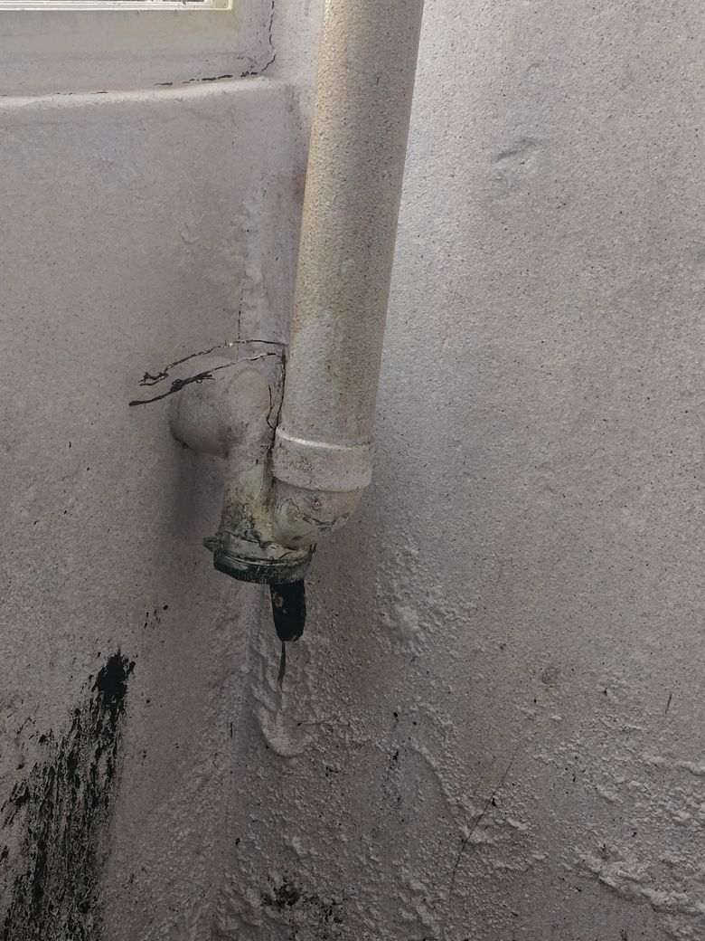 우수관이 이렇게 생겼고 작은 조각이 쌓여서 윗층 연결구에서 물이 넘쳐서 떨어졌습니다.