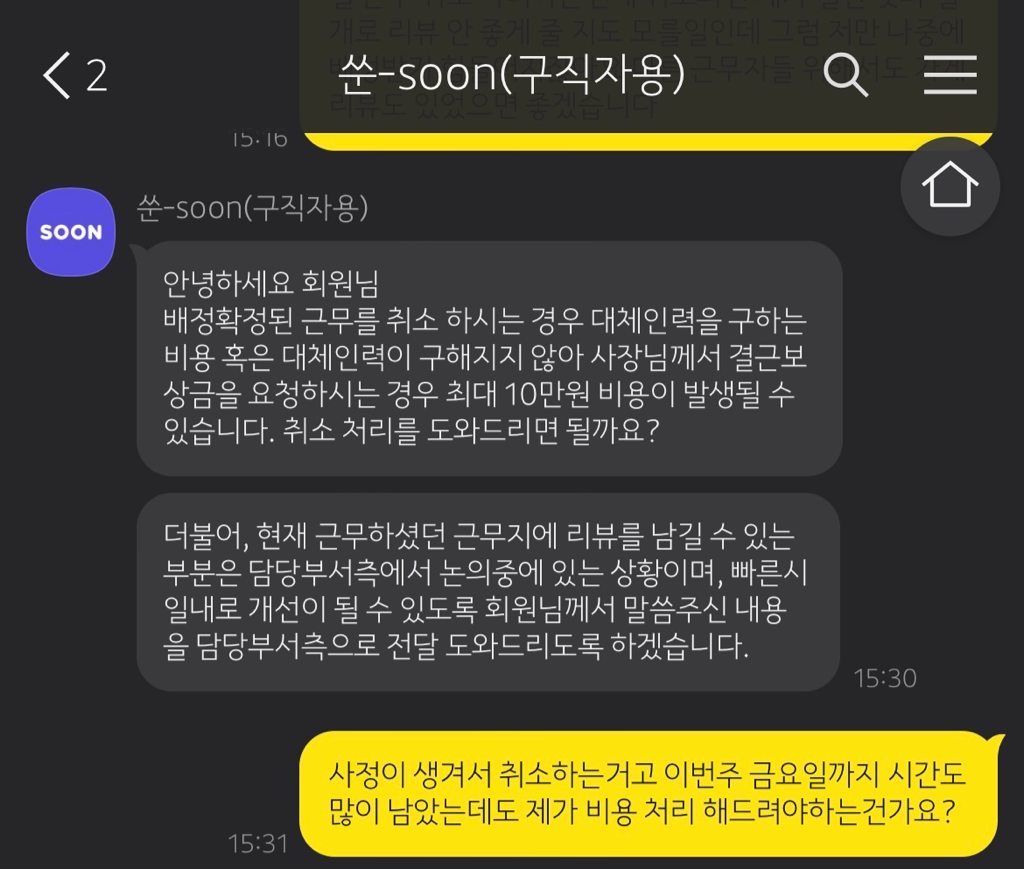 그런데 금요일에 개인사정이 생겨 근무하지 못할 것 같아 월요일 근무 끝나고 나서 쑨 어플 측으로 근무 취소를 요청했습니다