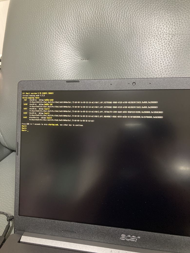 ESC를 1초동안 눌러야 startup.nsh 를 건너뛴다는데 아마 명령을 입력할수있는 상태라면 exit 엔터 해보세요