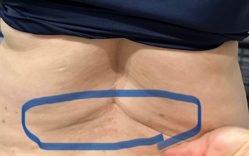복부비만으로 인한 전만증이 발생할 수 있으며 허리가 과하게 휘어지며 살이 접히며 사진과 같이 나타나는 것으로 보입니다.
