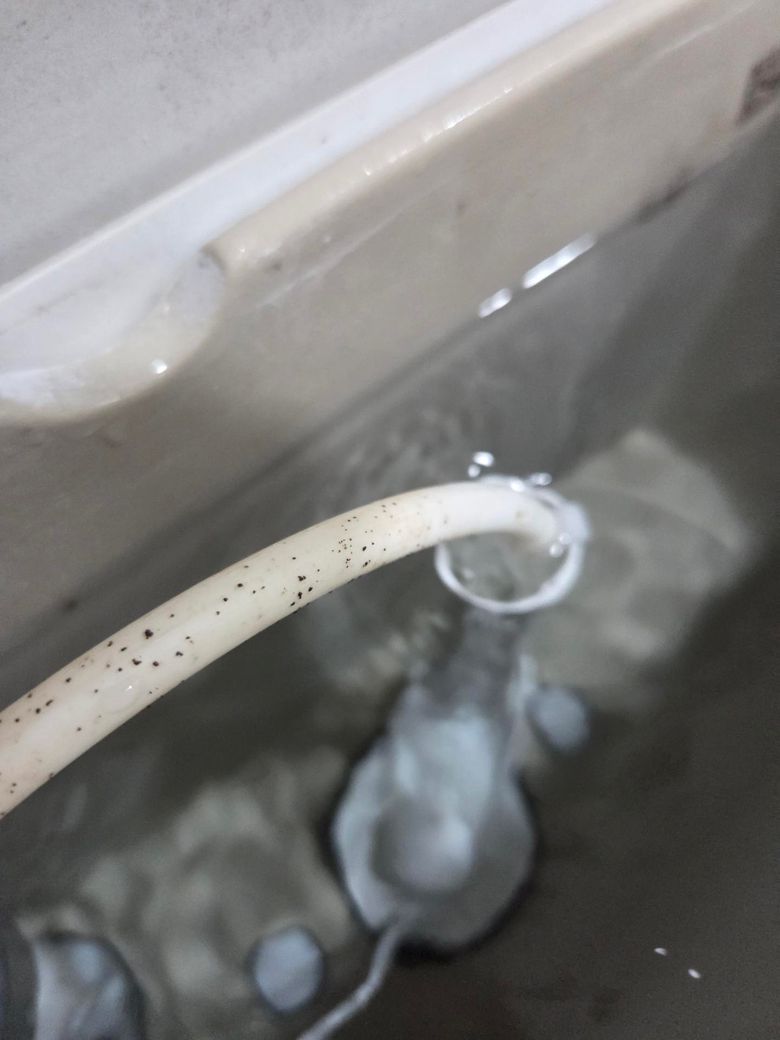 사진을 보면 변기 물탱크 안에서 충수관 윗부분으로 물이 계속 조금씩 흘러나오는 모습입니다. 따라서 뚜껑을 열고 플래퍼 밸브(고무마개)가 제자리에 잘 닫히는지 확인후 이물질이 있으면 제거합니다. 물이 넘칠 정도로 수위가 높다면 볼탑(또는 플로트) 높이를 조절해 수위를 낮춰주세요