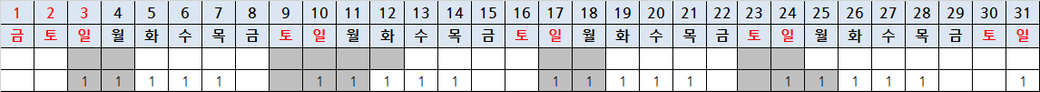 3월의 경우, 저는 총 21일을 근무하는데 동료는 20일을 근무합니다.