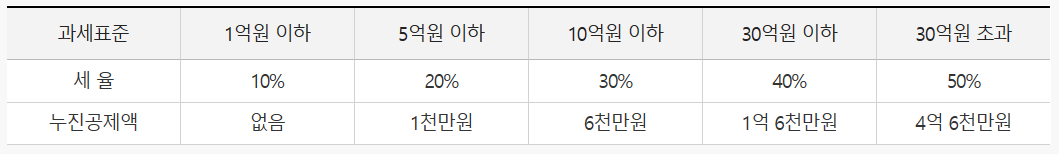 일반적으로 토지의 경우 시가산정이 어려워 개별공시지가로 평가하는 경우가 많으며, 직계존속으로부터의 증여라면 10년 간 5천만원(미성년자 2천만원)의 증여재산공제가 적용되거 증여재산가액에서 차감 후 과세표준이 산정되고, 과세표준에 따른 증여세율은 다음과 같습니다