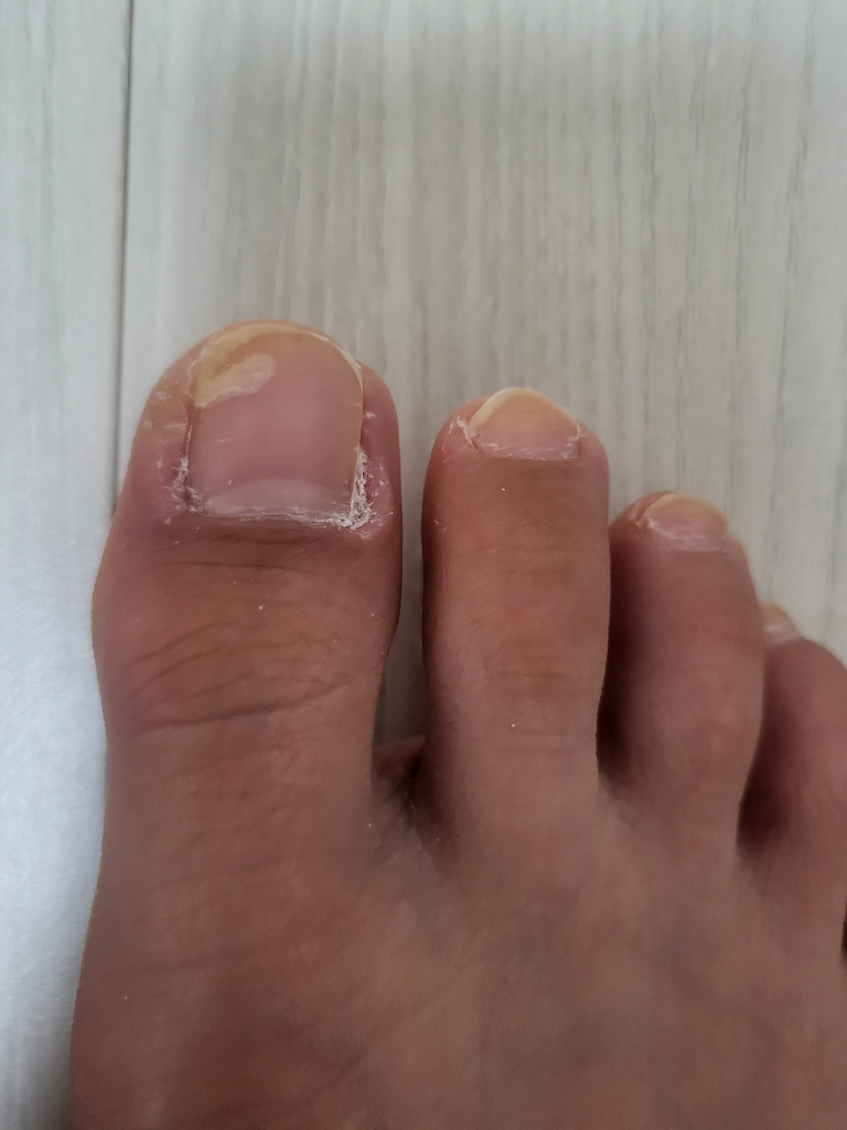 엄지발톱 오른쪽 끝 부분에 세로로 짧게 조그만하케 새로 삐져나오고 있습니다.