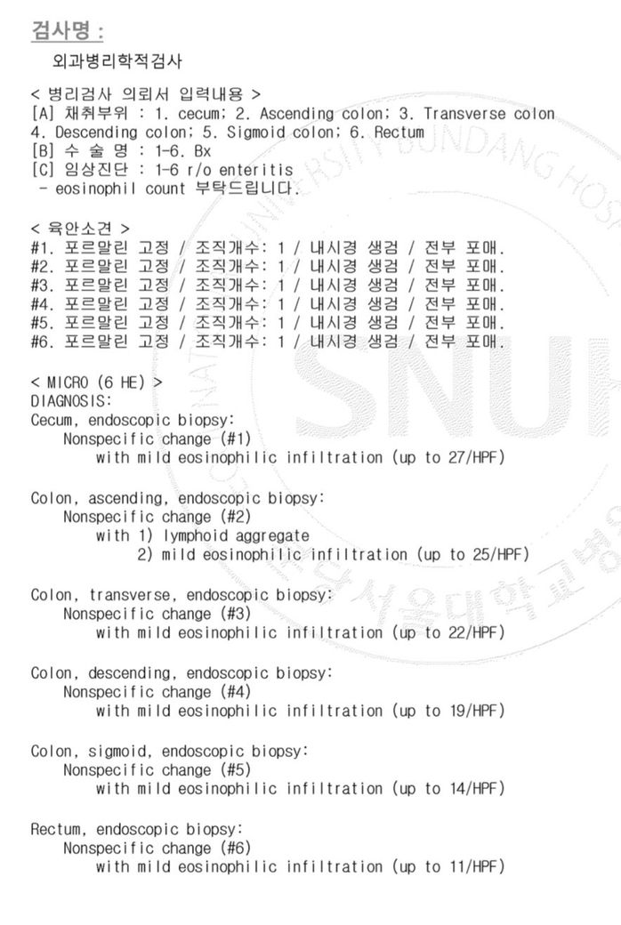 대장(맹장부터 직장까지) 모든 부위에서 “nonspecific change”로 보고되었고, 호산구가 고배율 시야 기준 약 11–27개 정도로 경미하게 증가해 있습니다. 구조적 파괴, 궤양, 이형성, 암세포는 언급되지 않았고 일부 부위에서 림프 집합체가 보이는데 이는 젊은 연령층에서 흔한 반응성 소견입니다. 소장(십이지장, 회장 말단) 역시 비특이적 십이지장염 또는 비특이적 변화로, 경도의 호산구 침윤이 동반된 정도입니다.