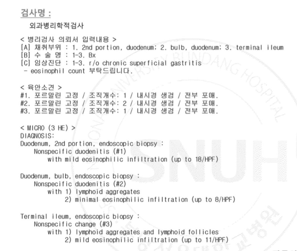 종합적으로 보면 비특이적인 십이지장염 소견, 그리고 전체적으로 경미한 호산구 침윤이 있다는 내용인 것으로 보입니다. 두 가지 모두 딱히 크게 의미를 부여할만한 소견으로 보이지는 않아 보입니다.