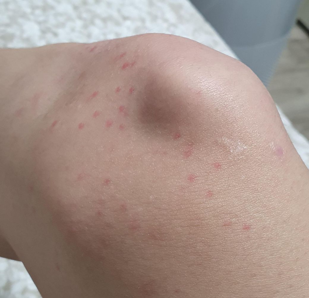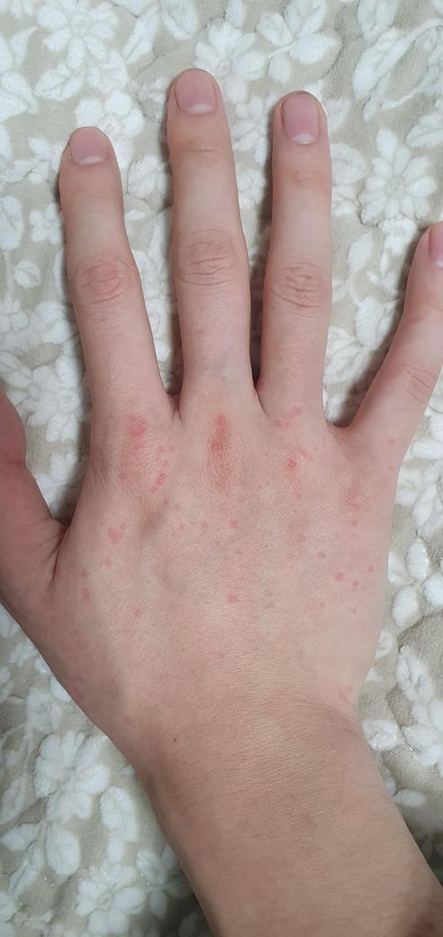 가끔씩 사진처럼 손목, 손등, 무릎에 붉은 두드러기가 올라옵니다.