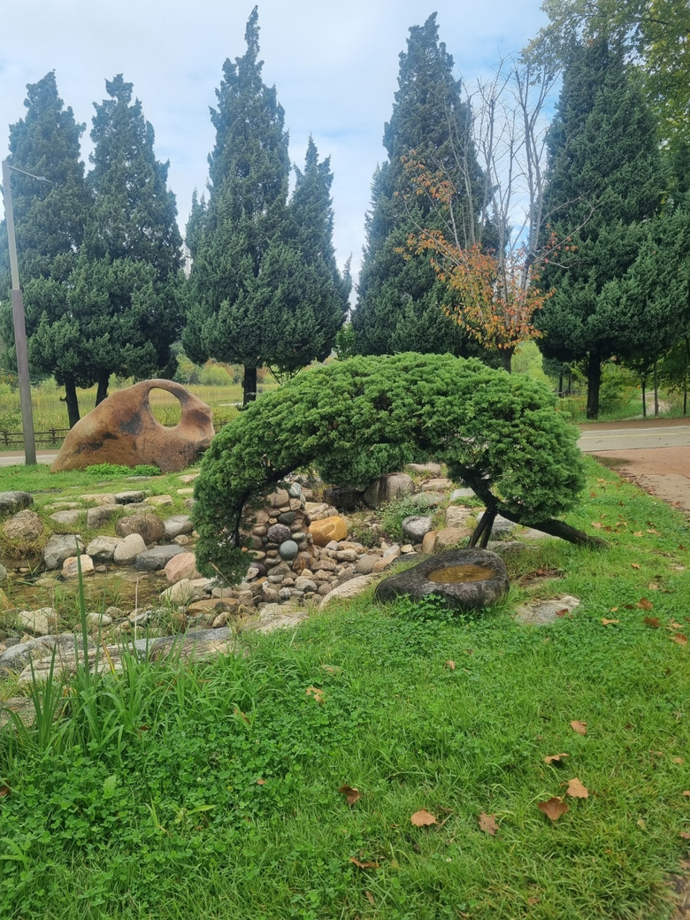 공원의 연못가에 나무가 구부려져 있습니다. 보기에는 멋있을지 몰라도 제가 보기엔 멀쩡한 나무 분재 다루듯이 비뚤어지게 만들은 것 같습니다. 나무는 고맙다고 할가요? 고통스러워할가요?
