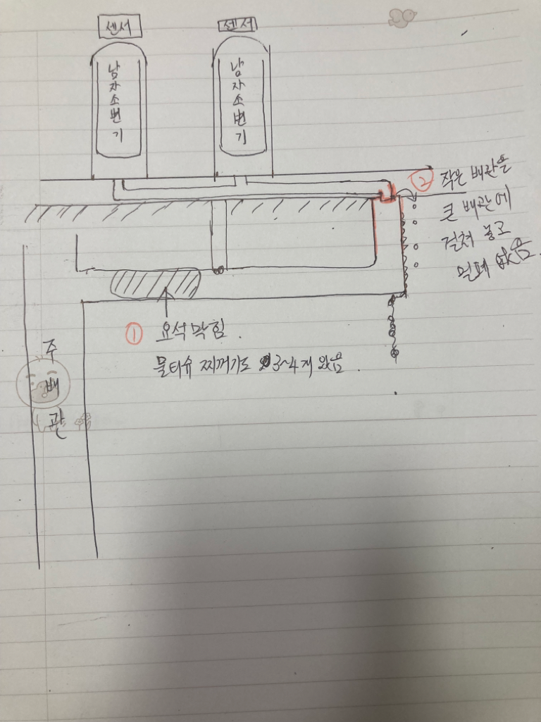기사님 말씀이 누수 원인은 3층으로 내려가 있는 배관에 요석이 막히면서 물이 역류로 올라오는데 2번 쪽 배관공사가 가는 배관을 굵은 배관에 꽂아놓고 밀폐 작업을 하지 않아서 오물이 넘치면서 새서 아래층으로 내려갔답니다. 저희는 건물 지을 당시 그대로이고 배관은 그동안 아무도 건드린 적 없습니다.