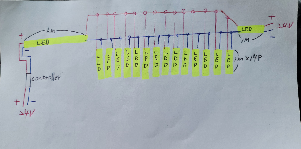 그림처럼 5m LED 스트립과 1m LED 스트립을 직렬로 연결하고 그 사이에 1m 스트립 14개를 병렬 연결하는 것은 전기적으로 문제가 될 수 있습니다.