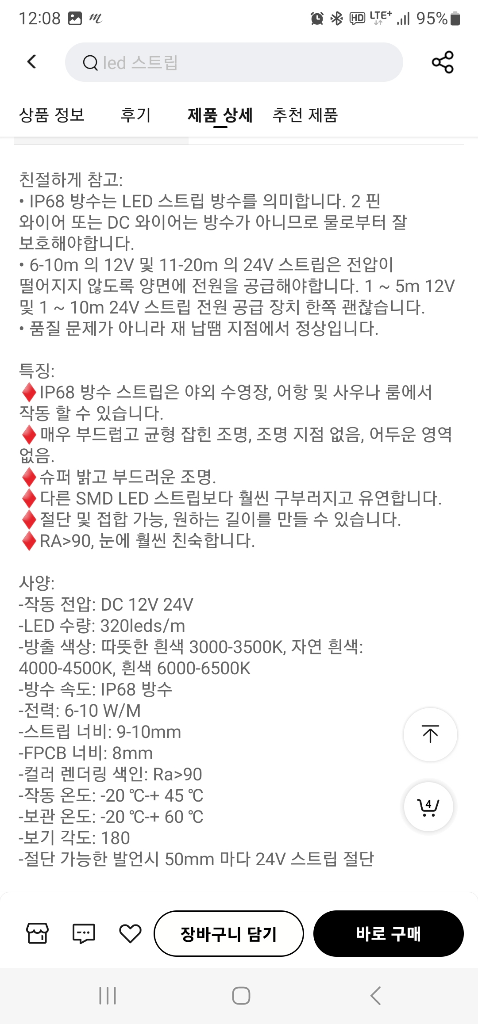 특히 24V LED 스트립은 일정 길이(예:5~10m)를넘어서면 전력 공급이 어려워 전압 강하가 발생하니, 전원인젝션(중간에 전원보강)이나 병렬 연결 방식으로 안정성을 확보하는게 좋습니다.