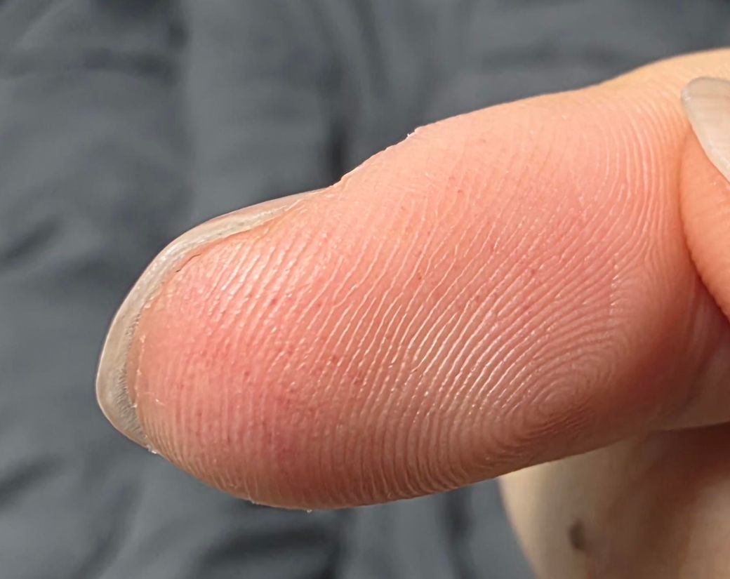 사진상으로는 손가락 끝(지문 부위)에 미세한 홍반성 점상 병변이 산재해 보입니다. 융기되거나 수포, 농포 형태는 아니고, 피부결은 유지되어 있습니다.