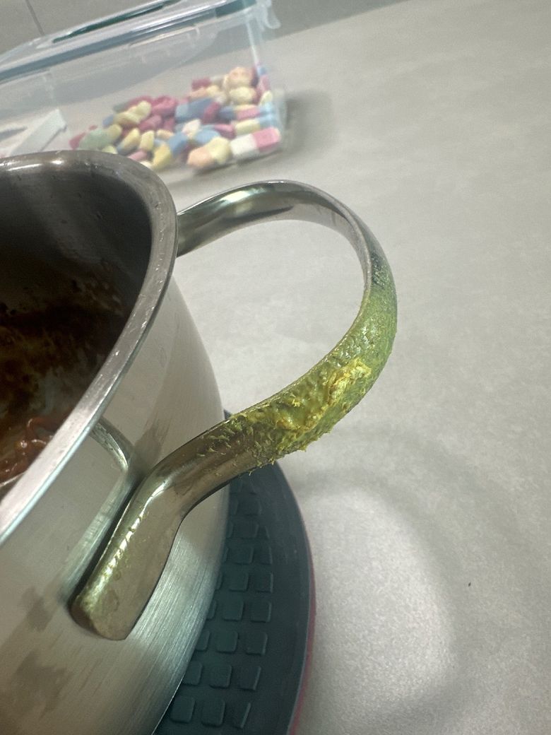 냄비 손잡이에 타올이 눌러 붙었다면 제거 하기가 쉽지 않을듯 보입니다. 베이킹 소다나 식초를 혼합해서 장시간 담가 두셨다가 철수세미로 문질러서 지워 보시기 바랍니다. 그래도 안되면 냄비를 교체 하셔야 할듯 싶네요.