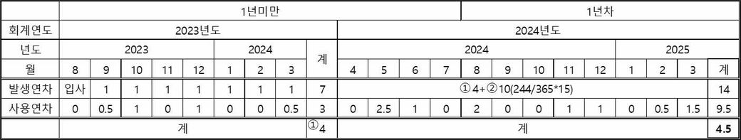 회계년도의 잔여연차는 4.5개인데 이중 1년미만 미사용 연차(소멸시점 7월31일)가 포함되어 있을때는