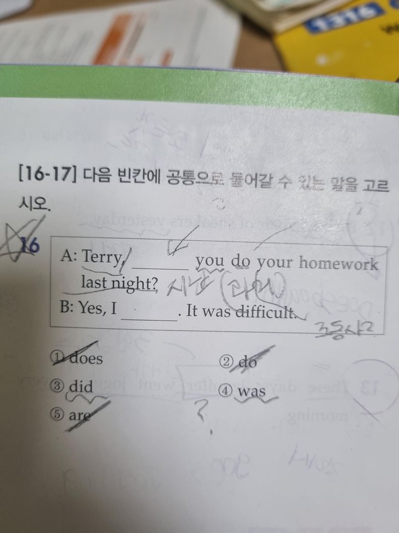 Terry / " _ you do your homework last night? Yes,I . It was difficult.