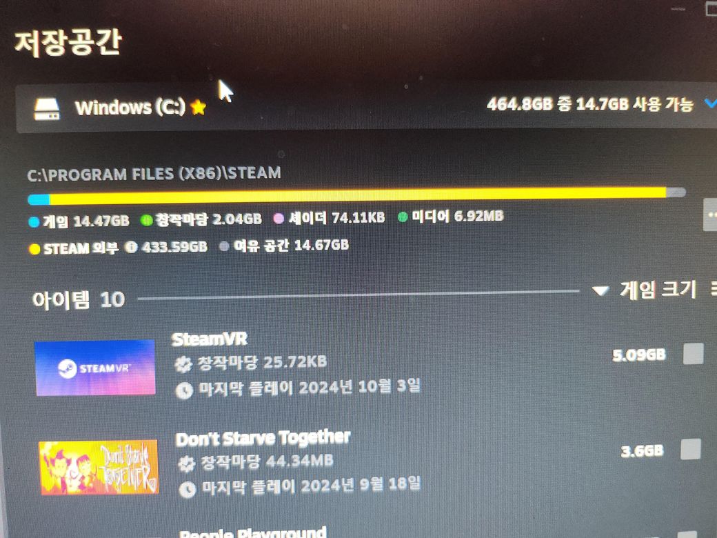 게임을 깔려하는대 별로 깐것도없는대 용량이부족한데 왜이런가요? 스팀을 들어가서 확인해봤는대 steam외부? 이게 다차지하고있는대 아시는분있을까요..? 저것때문에 겜도못깔고있어요
