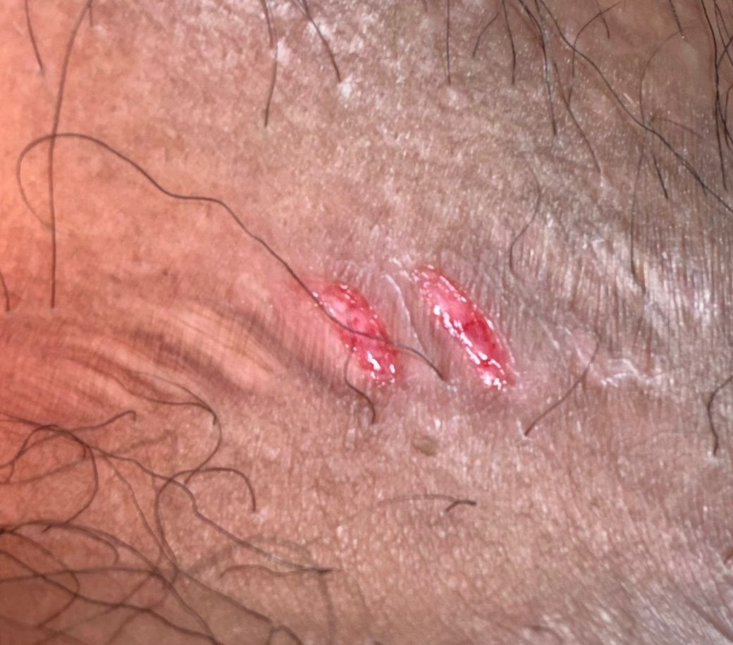 남성 고환과 다리 사이 사타구니 쪽인데 저런 식으로 상처인지 찢어진 건지 무언가 나 있고 아침에 일어나서? 나중에 보면 진물 같은 게 나오는 것 같아요