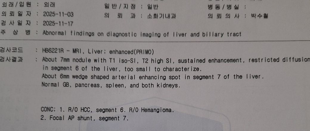 판독의 소견: R/O HCC(간세포암 가능성 배제 불가) vs R/O 혈관종(양성종양 가능성)
