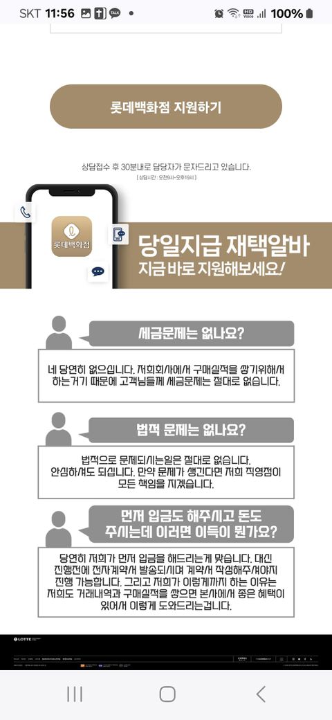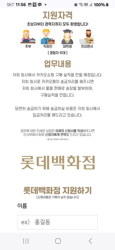 각별한 주의를 요합니다. 해당 업체가 롯데백화점은 아니고 사기, 금전세탁, 보이스피싱 자금 인출책 등의 이용될 수 있어 각별한 주의가 필요합니다.