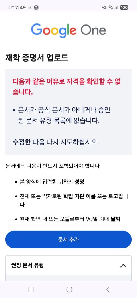 Google One에 제출한 재학증명서가 반려되었습니다.
