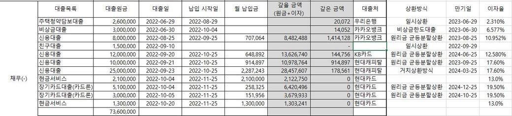 현재 대출금액만 7,360만원입니다.(친구에게 빌려준 돈 7,820만원)