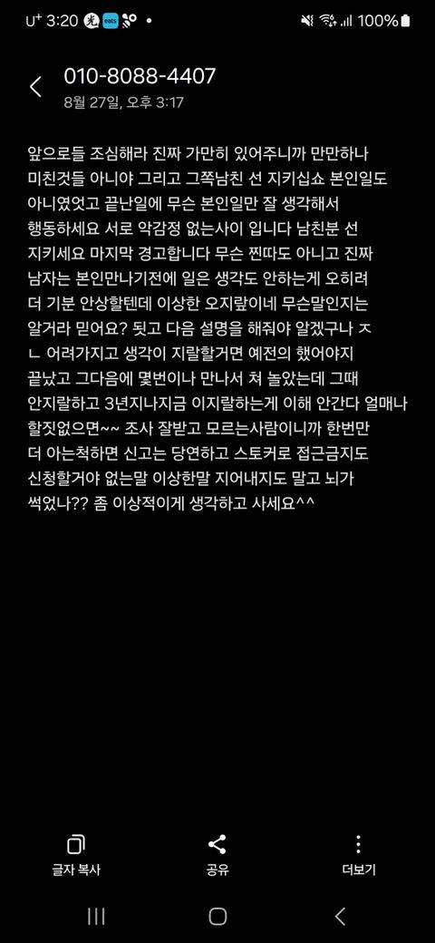 사진은 전남친분이 신고접수 하고난후 하루뒤 문자 가 날라온 사진입니다 저것도 명예훼손 해당사항인지 한번봐주세요
