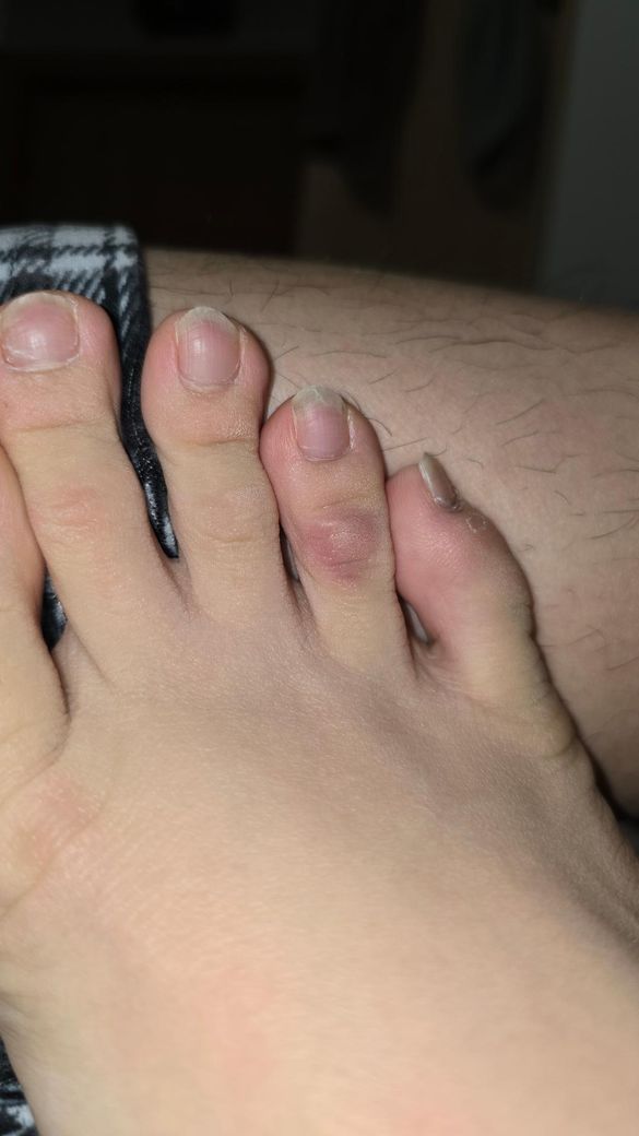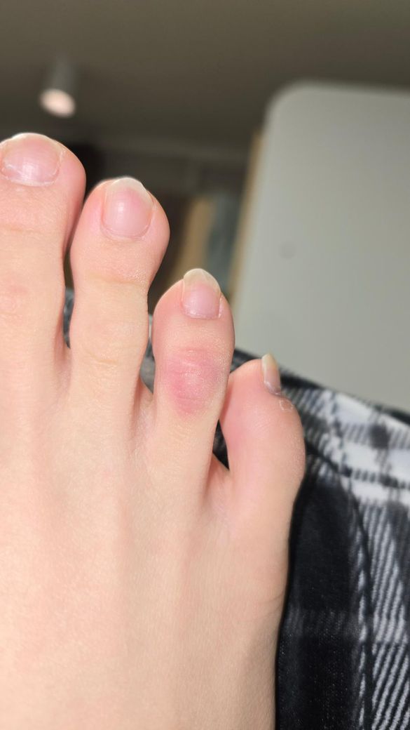 사진상으로는 네 번째 발가락에 국한된 홍반과 약간의 부종, 표면 자극 소견이 보이며, 말씀하신 것처럼 마찰(신발, 양말)에 의한 국소 피부 자극 또는 경미한 접촉성 피부염 가능성이 가장 높습니다. 특히 한 개 발가락에만 국한되고, 통증보다 가려움이 동반된 점은 감염보다는 자극성 병변 쪽에 더 부합합니다.
