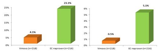 실제 임상시험 결과 아래 그림과 같이 위, 십이지장 궤양 발생률이 상당히 많이 감소된 것을 확인할 수 있었습니다. (왼쪽: 위궤양, 오른쪽: 십이지장궤양)