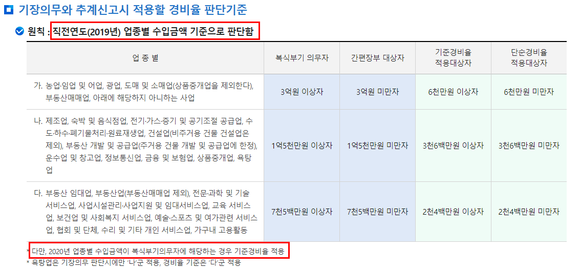 적어도 사업자 본인은 자신이 단순경비율 적용 대상자인지, 기준경비율 적용 대상자인지 알고 있는 상태로 사업을 영위할 수 있어야 합니다.