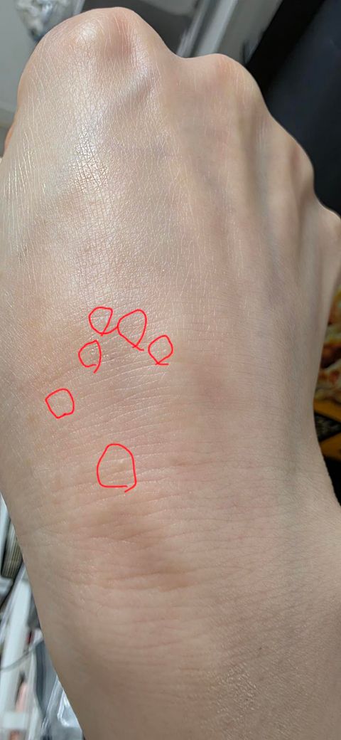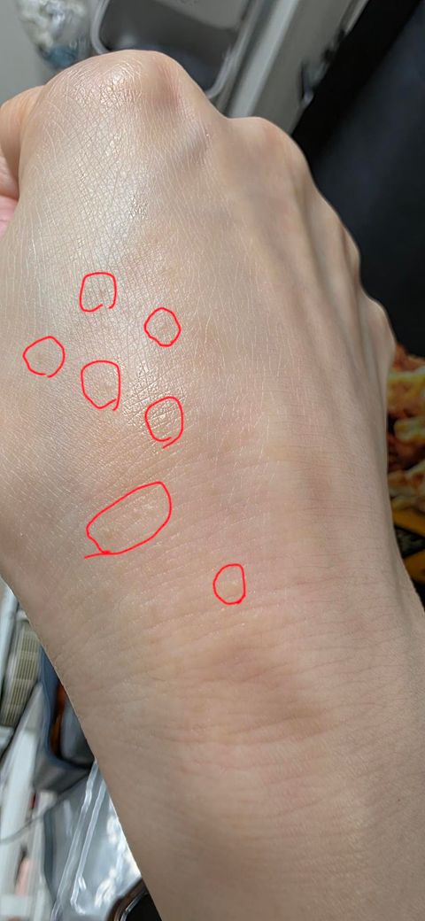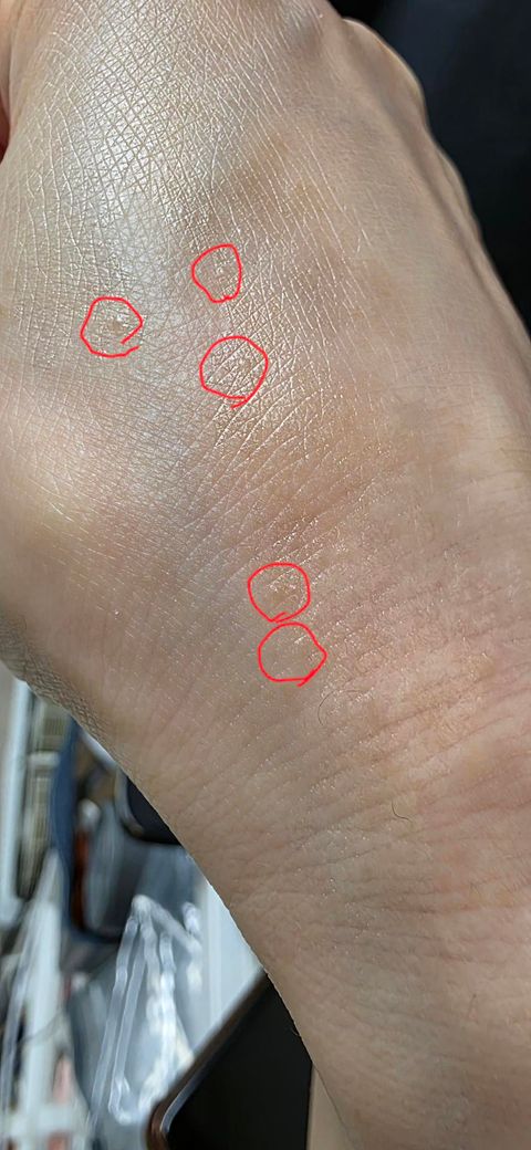 사진상 손등에 표시해주신 병변들을 보면, 주변 피부보다 약간 융기된 편평한 구진(flat-topped papule) 형태로, 색조 변화가 크지 않고 여러 개가 산재한 양상입니다. 20년 전부터 존재했고 목에서 편평사마귀(verruca plana)가 확진된 이력이 있다는 점을 함께 고려하면, 손등의 병변도 편평사마귀일 가능성이 상당히 높습니다.