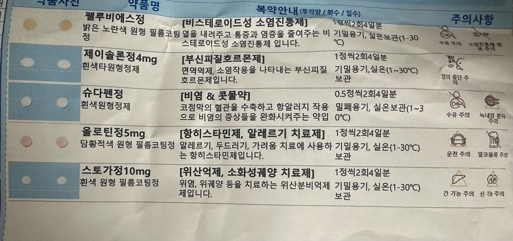올로틴정 같은 항히스타민제와 슈다펜정은 술과 만나면 심한 졸음과 어지러움을 유발하며, 펠루비에스정(소염진통제)과 제이솔론정(스테로이드)은 술과 함께 복용 시 위점막에 큰 손상을 줄 수 있습니다. 특히 어제 복용하신 공황장애 약 성분이 여전히 체내에 남아있어 술과 반응하면 예상치 못한 과진정 상태나 호흡 곤란이 올 수 있으므로 오늘 술은 피하시는 것이 가장 안전합니다. 부득이하게 마시게 된다면 아주 소량에 그쳐야 하며, 조금이라도 몸 이상이 느껴지면 즉시 중단하셔야 합니다. 감사합니다.