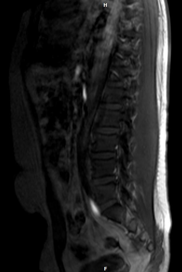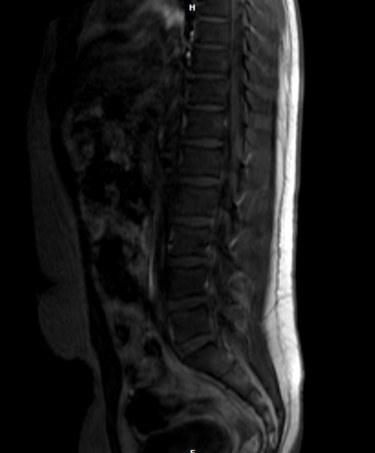 두 장의 MRI 영상을 확인했습니다. 말씀하신 첫 번째 사진의 상부 흉추 레벨, 척추 앞쪽(전방)에 위치한 밝은 고신호 음영이 보입니다.