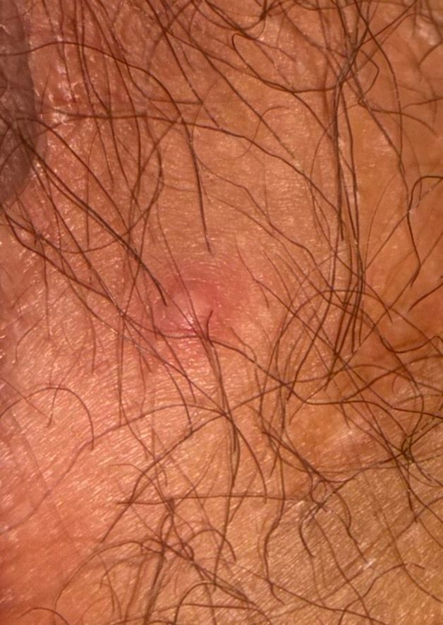 사진상 병변은 5mm 내외의 홍반성 구진으로 보이며 중심부에 약한 융기와 광택이 있습니다. 수포가 다발성으로 모여 있는 형태는 아니고, 궤양도 보이지 않습니다. 현재 통증이 “건드리면 아픈 여드름 느낌”이라면 임상적으로는 단순 염증성 모낭염 또는 피지선 염증, 초기 피하 농양 가능성이 더 높아 보입니다.