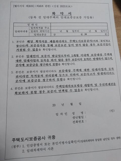 확약서 등록전 임대주택의 임대보증금보증 가입용