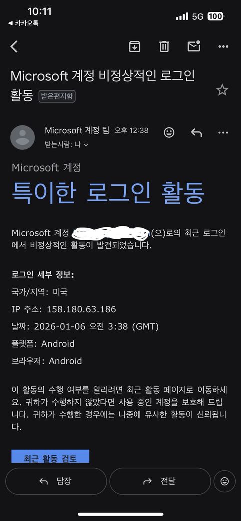 저 이메일 자체가 마이크로소프트 팀을 사칭해서 보낸건 아닌지 걱정도 되고, 어떻게 해야할까요?