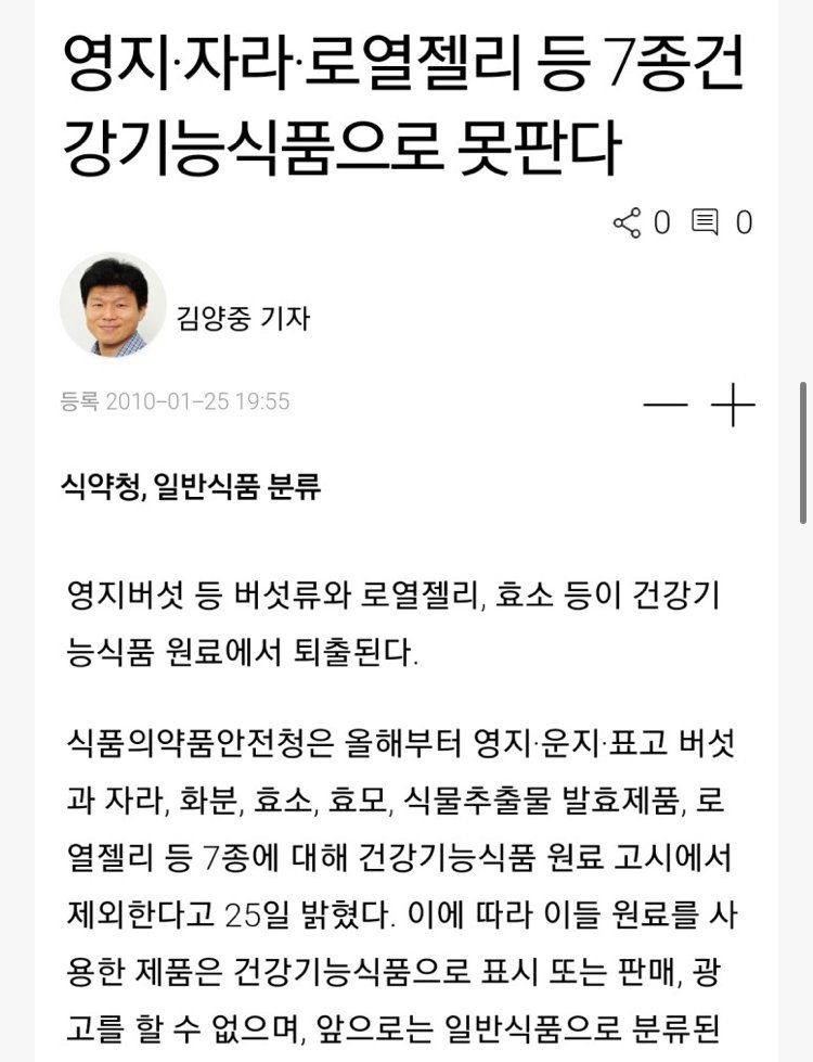 2010년 초에 식품의약안정청에서 영지.운지.표고 버섯.자라.화분.효소.효모.식물 추출물 발표제품.로열젤리 등 7종에 대해 건강식품 원료고시에서 제외되었다고 하는데 맞나요??