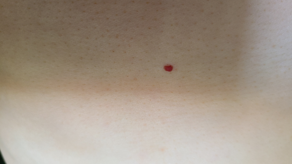 체리혈관종 등의 가능성이 있으며 이는 모세혈관 등으로 이루어진 양성종양에 해당할 수 있습니다.