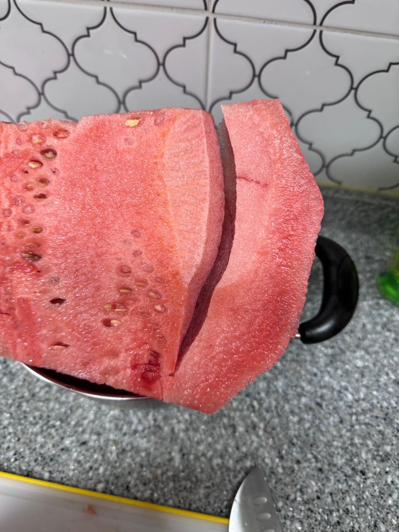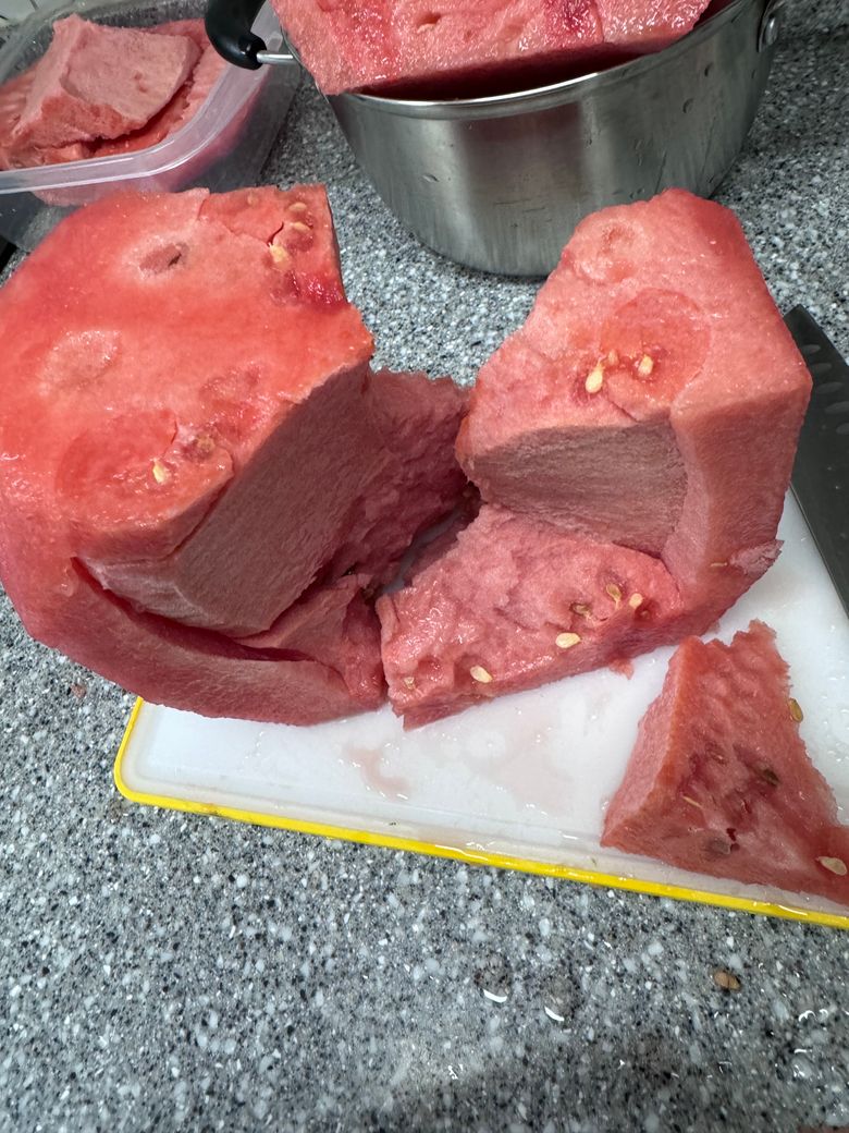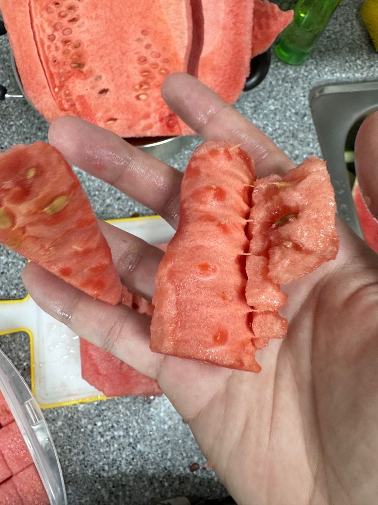 어제 수박을 샀는데 사진처럼 안이 쩍쩍 갈라지고 모양이 너무 이상한데..... 먹어도 되는 수박 맞을까요? 답변 부탁드리겠습니다.