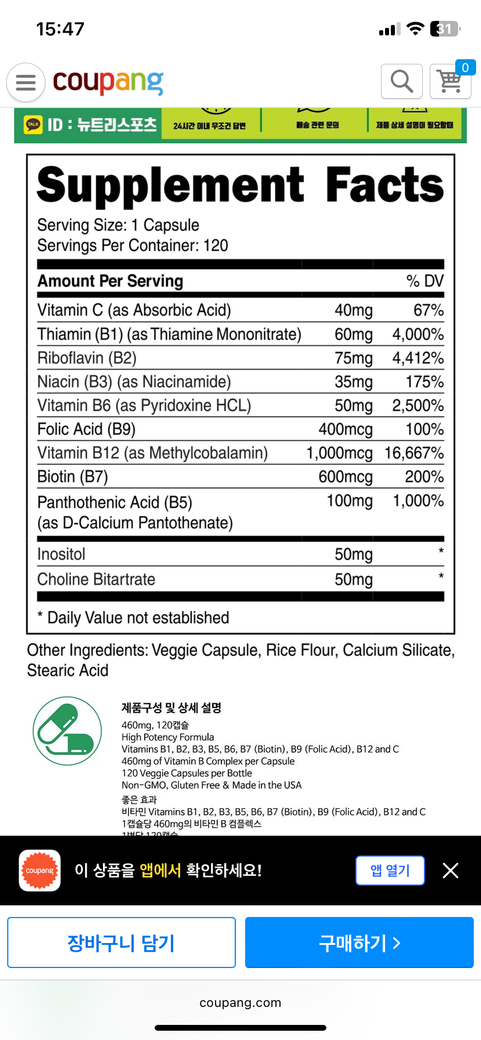 그러나 콜린과 이노시톨 성분은 건강유지목적으로는 아래 비타민B군 제품에 들어있는 양으로도 충분한 편이라서,
