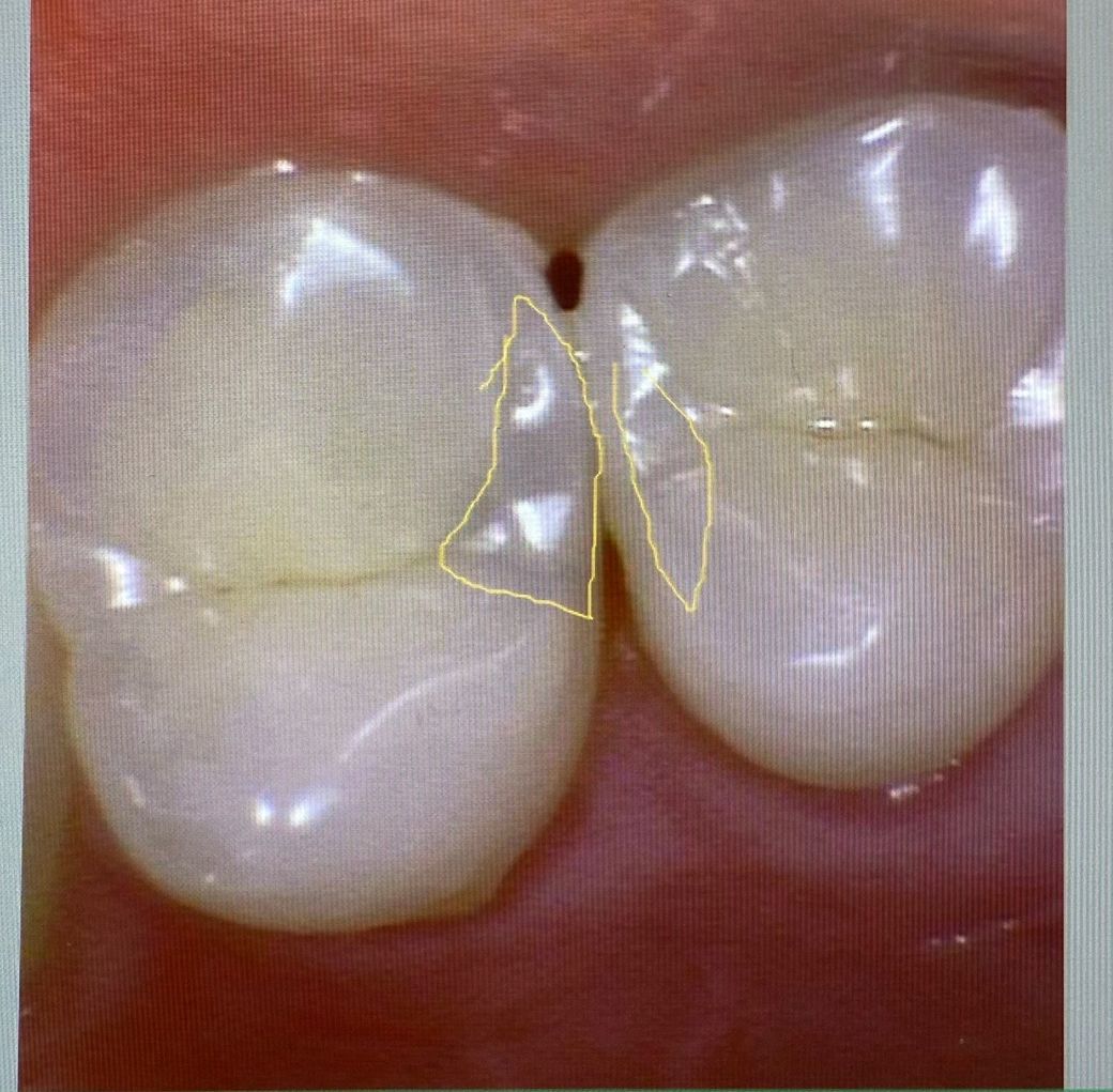 충치가 육안으로 보이지만 사진상으로 보이지 않는 경우에는 충치가 많이 진행되지 않았을 가능성이 있습니다. 인접면 충치의 경우에는 일반적으로 인레이라고 하는 보철물 치료를 하게 됩니다.