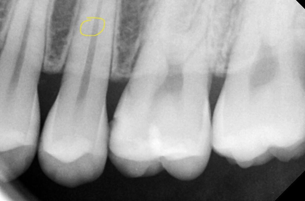 사진 수정해서 좌우반전하거나 그러셨나요? 엑스레이는 왼쪽 위 작은 어금니이고, 임상사진은 오른쪽 위로 추정됩니다.